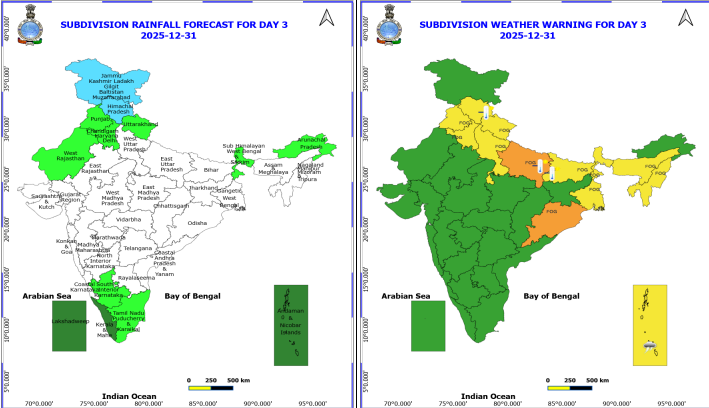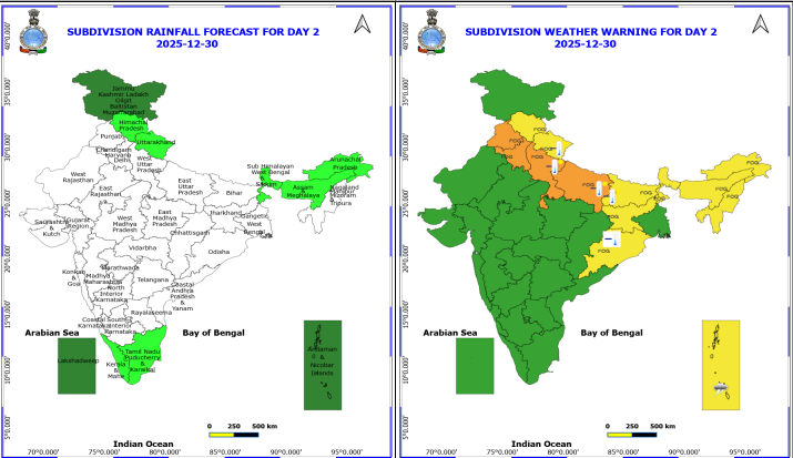 मौसम विभाग के अनुसार 31 दिसंबर तक हरियाणा, चंडीगढ़, पश्चिमी उत्तर प्रदेश और पंजाब में रात/सुबह के घंटों के दौरान बहुत घना कोहरा छाए रहने की बहुत संभावना है; 01 जनवरी तक पूर्वी उत्तर प्रदेश में. ओडिशा में 31 दिसंबर– 02 जनवरी 2026 के दौरान. जम्मू-कश्मीर-लद्दाख-गिलगित-बाल्टिस्तान-मुज़फ़्फ़राबाद और मध्य प्रदेश में 30 तारीख तक रात/सुबह के घंटों में कुछ जगहों पर घना कोहरा छाए रहने की संभावना है. हिमाचल प्रदेश, उत्तराखंड, पंजाब, हरियाणा चंडीगढ़, उत्तर प्रदेश और बिहार में 5 जनवरी तक; दिल्ली में 31 दिसंबर तक; अरुणाचल प्रदेश में 31 दिसंबर तक और असम और मेघालय और नागालैंड, मणिपुर, मिजोरम और त्रिपुरा में 3 जनवरी तक; उप-हिमालयी पश्चिम बंगाल और सिक्किम; ओडिशा में 3 जनवरी तक और गंगा के मैदानी पश्चिम बंगाल में 31 दिसंबर- 03 जनवरी के दौरान और झारखंड में 31 दिसंबर 2025 तक शीतलहर की चेतावनी दी गई है.