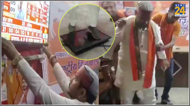 рдРрд╕рд╛ рд╣реА рдПрдХ рд╡реАрдбрд┐рдпреЛ рд╕реЛрд╢рд▓ рдореАрдбрд┐рдпрд╛ рдкрд░ рд╡рд╛рдпрд░рд▓ рд╣реЛ рд░рд╣рд╛ рд╣реИред рдЬрд┐рд╕рдореЗрдВ рджреЗрдЦрд╛ рдЬрд╛ рд╕рдХрддрд╛ рд╣реИ рдХрд┐ рдПрдХ рдЧреМрд╕реЗрд╡рдХ рдЯреАрд╡реА рдкрд░ рдирддреАрдЬреЗ рджреЗрдЦ рд░рд╣рд╛ рд╣реЛрддрд╛ рд╣реИред рдЬрд┐рд╕рдореЗрдВ рдПрдирдбреАрдП рдХрд╛ рдЖрдВрдХрдбрд╝рд╛ 296 рдФрд░ рдЗрдВрдбрд┐рдпрд╛ рдХрд╛ рдЖрдВрдХрдбрд╝рд╛ 229 рджрд┐рдЦрддрд╛ рд╣реИред рдЗрд╕ рдирддреАрдЬреЗ рд╕реЗ рд╣рддрд╛рд╢ рд╣реЛрдХрд░ рд╕рдорд░реНрдердХ рдЪрд▓рддреЗ рдЯреАрд╡реА рдХреЛ рдЙрдЦрд╛рдбрд╝ рд▓реЗрддрд╛ рд╣реИред рдлрд┐рд░ рдЗрд╕реЗ рдЬрдореАрди рдореЗрдВ рдкрдЯрдХрдХрд░ рддреЛрдбрд╝ рджреЗрддрд╛ рд╣реИред