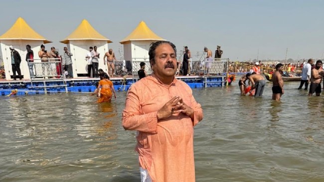 कांग्रेस सांसद राजीव शुक्ला ने संगम में लगाई डुबकी