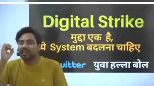 वीडियो में स्क्रीन पर गगन प्रताप दिख रहे हैं। पीछे एक बोर्ड लगा है, जिसमें लिखा है- डिजिटल स्ट्राइक… मुद्दा एक है, ये सिस्टम बदलना चाहिए, युवा हल्ला बोल। वीडियो की शुरुआत में गगन प्रताप कहते हैं कि ये सरकार निकम्मी है। जितने भी सरकार के लोग इस वीडियो को देख रहे हैं, मैं उनसे साफ-साफ और सीधे शब्दों में कहना चाहता हूं कि तुम्हारी सरकार निकम्मी है।