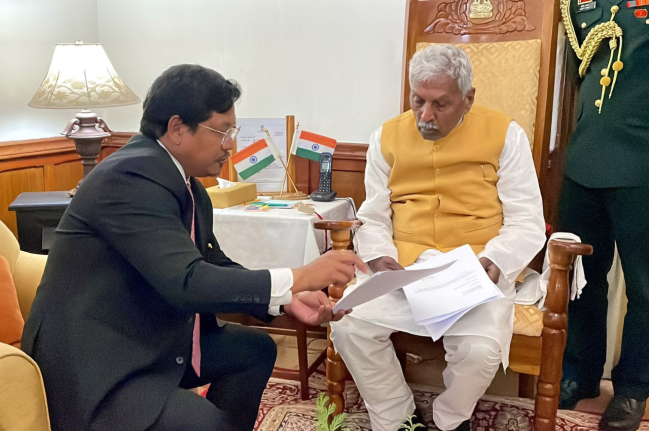 "Submitted the letter of support to Governor Phagu Chauhan signed by 32 MLAs of the NPP, BJP, HSPDP and 2 Independent to form the Government in alliance with the NPP," tweets Conrad Sangma#MeghalayaElections pic.twitter.com/jxoHEOZHUV