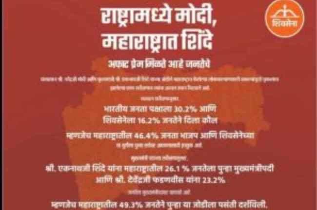 विज्ञापन में सर्वे के अनुसार बताया गया है की भारतीय जनता पार्टी को 30.2% और शिवसेना को 16.2% लोगों ने अपनी पसंद किया है यानी महाराष्ट्र की 46.4% जनता गठबंधन (युती) को फिर से सत्ता में लाने के लिए इच्छुक है। सर्व में चौकनेवाली बात है कि मुख्यमंत्री को लेकर भी इस सर्वे में 26.1% जनता मौजूदा मुख्यमंत्री एकनाथ शिंदे को दुबारा मुख्यमंत्री के रूप में देखना चाहती है तो देवेंद्र फडनविस को 23.2% जनता मुख्यमंत्री देखना चाहती है यानी महाराष्ट्र की 49.3% जनता ने शिंदे फडनविस जोड़ी को फिरसे पसंद किया है।