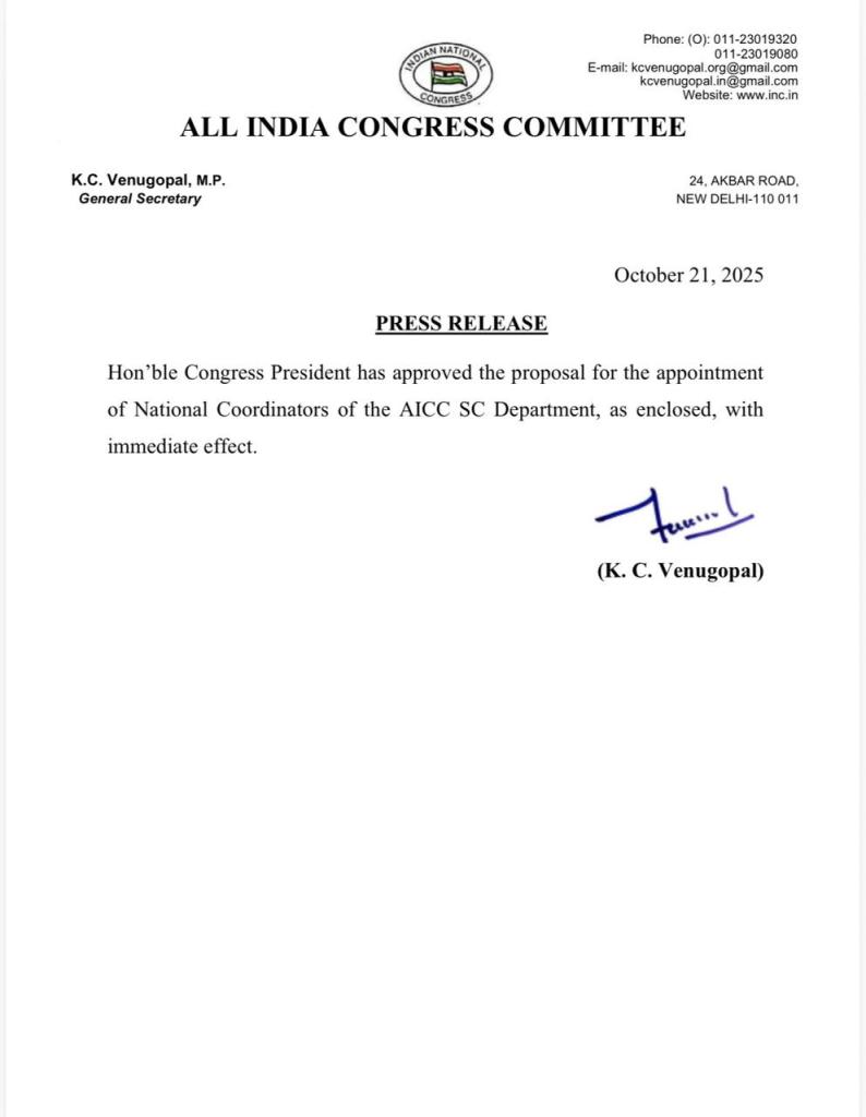 अखिल भारतीय कांग्रेस कमेटी (AICC) ने पदाधिकारियों की नियुक्ति को मंजूरी दे दी, जो तत्काल प्रभाव से लागू होंगे. महासचिव के.सी. वेणुगोपाल, सांसद द्वारा जारी प्रेस रिलीज में विस्तृत रूप से दी गई यह घोषणा आने वाले चुनावों, राजनीति के मद्देनजर की गई है.