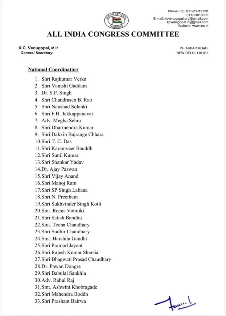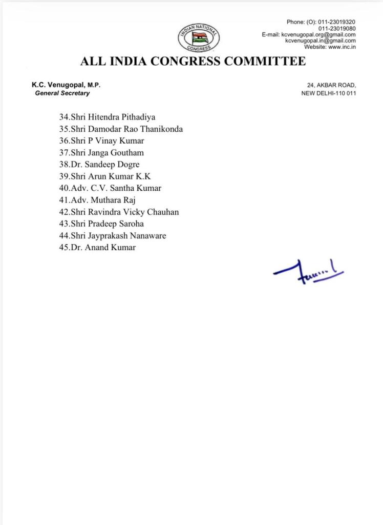 AICC की लिस्ट में एडवोकेट राहुल राज और एडवोकेट सी.वी. संथा कुमार, बजरंगे छारा और अजय पासवान, रीना वाल्मीकि, हर्षिता गांधी और अश्विनी खोबरागड़े समेत कई लोगों और दिग्गजों नाम शामिल है.