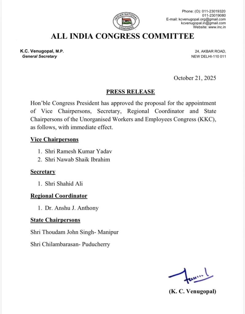 इसके साथ ही कांग्रेस अध्यक्ष ने असंगठित श्रमिक एवं कर्मचारी कांग्रेस (केकेसी) के लिए प्रमुख नेताओं की नियुक्ति को मंजूरी दे दी है,ीए नियुक्ति भी तत्काल प्रभाव से लागू होगी. इस नियुकीट में उपाध्यक्ष रमेश कुमार यादव और नवाब शेख इब्राहिम, सचिव शाहिद अली और क्षेत्रीय समन्वयक डॉ अंशु जे एंथोनी शामिल हैं का नाम शामिल है.