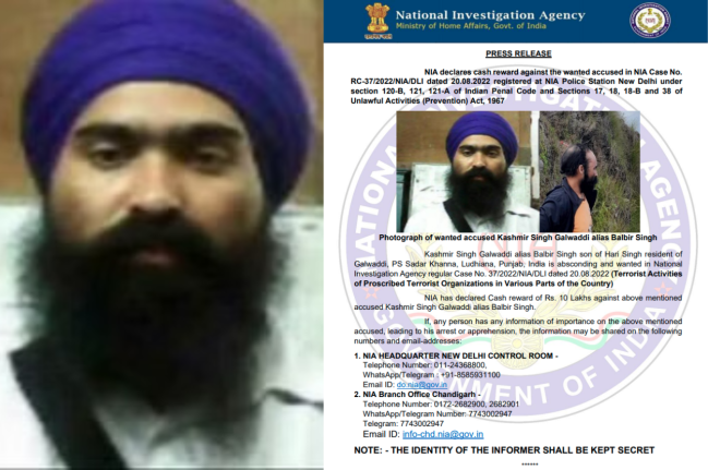 National Investigation Agency declares cash reward against the wanted accused, Kashmir Singh Galwaddi alias Balbir Singh in an NIA case under section 120-B, 121, 121-A of IPC and Sections 17, 18, 18-B and 38 of Unlawful Activities (Prevention) Act, 1967. pic.twitter.com/KxAyJAah5N