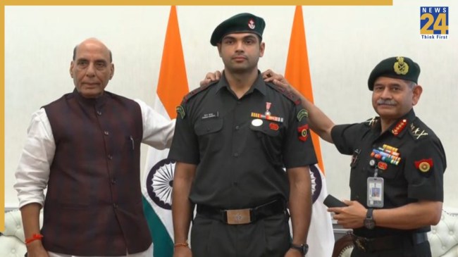 रक्षा मंत्री राजनाथ सिंह ने 22 अक्टूबर 2025 को साउथ ब्लॉक में आयोजित पिपिंग समारोह के दौरान स्टार भाला फेंक खिलाड़ी और दो बार के ओलंपिक पदक विजेता नीरज चोपड़ा को प्रादेशिक सेना में लेफ्टिनेंट कर्नल के मानद पद का चमचमाता प्रतीक चिन्ह औपचारिक रूप से प्रदान किया. लेफ्टिनेंट कर्नल (मानद) नीरज चोपड़ा और उनके परिवार के सदस्यों के साथ बातचीत करते हुए रक्षा मंत्री ने उन्हें दृढ़ता, देशभक्ति और उत्कृष्टता के लिए प्रयास करने की भारतीय भावना का प्रतीक बताया.