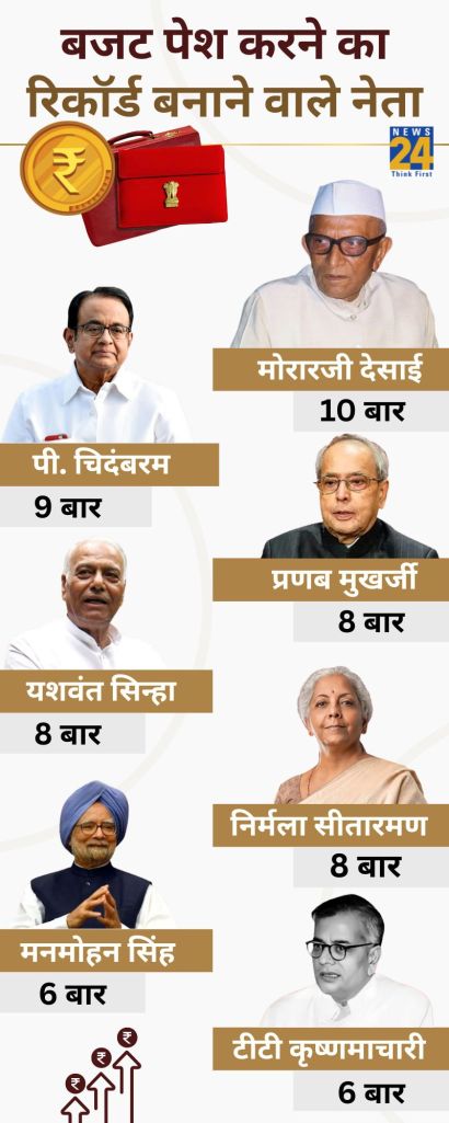 Union Budget: рд╡рд┐рддреНрдд рдордВрддреНрд░реА рдирд┐рд░реНрдорд▓рд╛ рд╕реАрддрд╛рд░рдордг 2 рдлрд░рд╡рд░реА 2026 рдХреЛ рдХреЗрдВрджреНрд░реАрдп рдмрдЬрдЯ рдкреЗрд╢ рдХрд░реЗрдВрдЧреА рдФрд░ рдЗрд╕ рдмрд╛рд░ рд╡реЗ рдЕрдкрдиреЗ рдХрд╛рд░реНрдпрдХрд╛рд▓ рдХрд╛ 9рд╡рд╛рдВ рдмрдЬрдЯ рдкреЗрд╢ рдХрд░реЗрдВрдЧреА. рдЗрд╕ рдмрдЬрдЯ рдХреЛ рдкреЗрд╢ рдХрд░рддреЗ рд╣реА рд╡реЗ рдкреВрд░реНрд╡ рд╡рд┐рддреНрдд рдордВрддреНрд░реА рдкреА. рдЪрд┐рджрдВрдмрд░рдо рдХреЗ 9 рдмрд╛рд░ рдмрдЬрдЯ рдкреЗрд╢ рдХрд░рдиреЗ рдХреЗ рд░рд┐рдХреЙрд░реНрдб рдХреА рдмрд░рд╛рдмрд░реА рдХрд░ рд▓реЗрдВрдЧреА. рдЖрдЬрд╛рджреА рдХреЗ рдмрд╛рдж рд╕реЗ рдЕрдм рддрдХ рд╕рдмрд╕реЗ рдЬреНрдпрд╛рджрд╛ рдмрд╛рд░ рдмрдЬрдЯ рдкреЗрд╢ рдХрд░рдиреЗ рдХрд╛ рд░рд┐рдХреЙрд░реНрдб 7 рдиреЗрддрд╛рдУрдВ рдХреЗ рдирд╛рдо рд╣реИ, рдЬрд┐рдирдореЗрдВ рдореЛрд░рд╛рд░рдЬреА рджреЗрд╕рд╛рдИ, рдкреА рдЪрд┐рджрдВрдмрд░рдо, рдкреНрд░рдгрдм рдореБрдЦрд░реНрдЬреА, рдпрд╢рд╡рдВрдд рд╕рд┐рдиреНрд╣рд╛, рдордирдореЛрд╣рди рд╕рд┐рдВрд╣, рдЯреАрдЯреА рдХреГрд╖реНрдгрдорд╛рдЪрд╛рд░реА рдХрд╛ рдирд╛рдо рд╢рд╛рдорд┐рд▓ рд╣реИ. рд╡рд╣реАрдВ рдЕрдм рдЗрд╕ рд▓рд╛рдЗрди рдореЗрдВ рдирд┐рд░реНрдорд▓рд╛ рд╕реАрддрд╛рд░рдордг рднреА рд▓рдЧреА рд╣реИрдВ рддреЛ рдЖрдЗрдП рдЬрд╛рдирддреЗ рд╣реИрдВ рдХрд┐ рдЙрдкрд░реЛрдХреНрдд рдореЗрдВ рд╕реЗ рдХрд┐рд╕рдиреЗ рдХрд┐рддрдиреА рдмрд╛рд░ рдмрдЬрдЯ рдкреЗрд╢ рдХрд┐рдпрд╛?