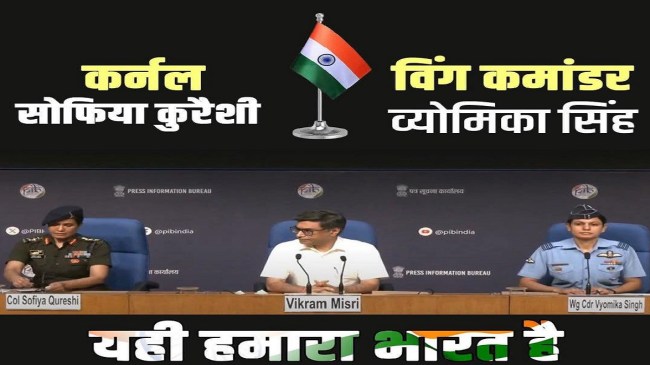 दरअसल, कांग्रेस लीडर द्वारा शेयर की गई फोटो ऑपरेशन सिंदूर ऑपरेशन को अंजाम देने सैन्य अफसरों की है। इनमें कर्नल सोफिया कुरैशी और विंग कमांडर व्योमिका सिंह और इनके बीच में विदेश सचिव विक्रम मिसरी बैठे हैं। इस फोटो पर कर्नल सोफिया कुरैशी और विंग कमांडर व्योमिका सिंह का नाम लिखा है और नीचे की तरफ यही हमारा लिखा है।