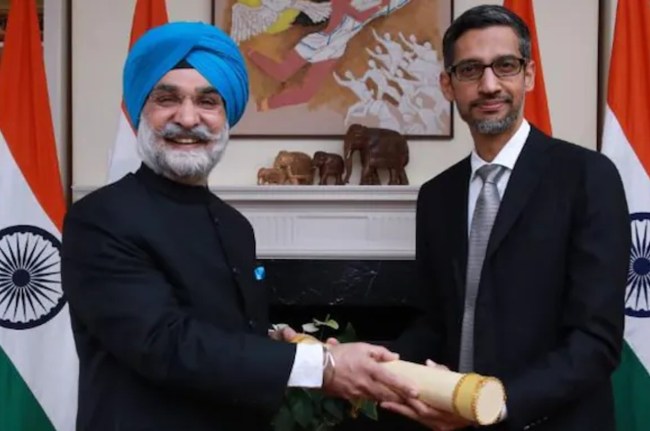 Delighted to hand over Padma Bhushan to Google CEO Sundar Pichai in San Francisco. His inspirational journey from Madurai to Mountain View, strengthening India-America economic & tech. ties, reaffirms Indian talent’s contribution to global innovation: Ambassador Taranjit S Sandhu pic.twitter.com/fxiSouYrIk