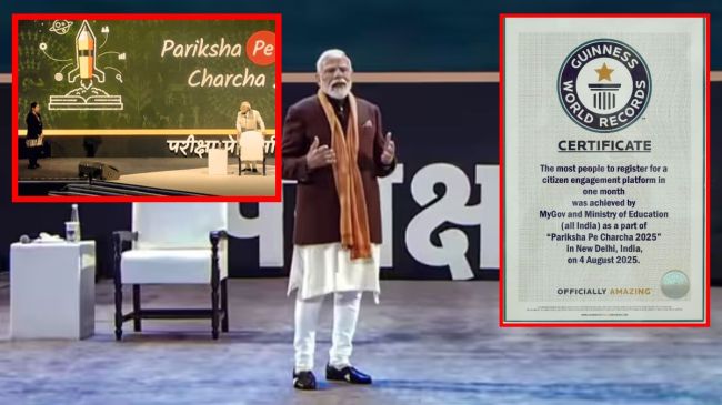 प्रधानमंत्री मोदी का ‘परीक्षा पे चर्चा 2025’ कार्यक्रम गिनीज़ वर्ल्ड रिकॉर्ड में शामिल हुआ। इस कार्यक्रम ने MyGov प्लेटफॉर्म पर 3.53 करोड़ से ज़्यादा रजिस्ट्रेशन के साथ विश्व रिकॉर्ड बनाया है।