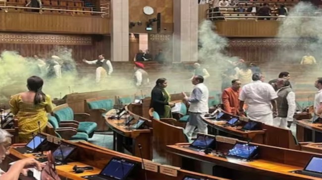 рдмрддрд╛ рджреЗрдВ рдХрд┐ рдмреБрдзрд╡рд╛рд░ 13 рджрд┐рд╕рдВрдмрд░ рдХреЛ рд╕рдВрд╕рдж рдореЗрдВ рдЖрддрдВрдХреА рд╣рдорд▓реЗ рдХреА 22рд╡реАрдВ рдмрд░рд╕реА рдХреЗ рдореМрдХреЗ рдкрд░ рд▓реЛрдХрд╕рднрд╛ рд╕рддреНрд░ рдХреЗ рд╢реВрдиреНрдпрдХрд╛рд▓ рдХреЗ рджреМрд░рд╛рди рд╕рд╛рдЧрд░ рд╢рд░реНрдорд╛ рдФрд░ рдордиреЛрд░рдВрдЬрди рдбреА рдирд╛рдордХ рджреЛ рдпреБрд╡рдХ рдШреБрд╕ рдЖрдПред рджрд░реНрд╢рдХ рджреАрд░реНрдШрд╛ рд╕реЗ рдЫрд▓рд╛рдВрдЧ рд▓рдЧрд╛рдиреЗ рдХреЗ рдмрд╛рдж рд╣рд╛рде рдореЗрдВ рд▓реА рдПрдХ рдХреЗрди рд╕реЗ рдкреАрд▓реЗ рд░рдВрдЧ рдХрд╛ рдзреБрдЖрдВ рдЫреЛрдбрд╝рд╛ рддреЛ рд╕реБрд░рдХреНрд╖рд╛ рджрд╕реНрддреЗ рдиреЗ рджреЛрдиреЛрдВ рдХреЛ рддреБрд░рдВрдд рдзрд░-рджрдмреЛрдЪрд╛ред рдкреБрд▓рд┐рд╕ рд░рд┐рдХреЙрд░реНрдб рдХреЗ рдореБрддрд╛рдмрд┐рдХ рд╕рдВрд╕рдж рдХреЗ рдирд┐рдЪрд▓реЗ рд╕рджрди рдореЗрдВ рдШреБрд╕ рдЖрдП рд╕рдВрджрд┐рдЧреНрдзреЛрдВ рдХреЗ рд╣рд╛рдереЛрдВ рд╕реЗ рдмрд░рд╛рдордж рдкрд░реНрдЪреЛрдВ рдореЗрдВ рддрд┐рд░рдВрдЧреЗ рдХреА рдкреГрд╖реНрдарднреВрдорд┐ рдореЗрдВ рдореБрдЯреНрдареА рдХреА рддрд╕реНрд╡реАрд░ рдФрд░ рдордгрд┐рдкреБрд░ рд╣рд┐рдВрд╕рд╛ рдХреЛ рд▓реЗрдХрд░ рдирд╛рд░реЗ рдЫрдкреЗ рдереЗред рдпрд╣ рдШрдЯрдирд╛рдХреНрд░рдо рд╕рдВрд╕рдж рдХреЗ рдЕрдВрджрд░ рдШрдЯрд╛, рд╡рд╣реАрдВ рдЙрд╕реА рджреМрд░рд╛рди рд╕рдВрд╕рдж рднрд╡рди рдХреЗ рдмрд╛рд╣рд░ рднреА рдХреБрдЫ рд╡реИрд╕реА рд╣реА рд╣рд░рдХрдд рдХреА рдЧрдИред рдЗрд╕рдореЗрдВ рд╢рд╛рдорд┐рд▓ рдиреАрд▓рдо рджреЗрд╡реА рдФрд░ рдЕрдореЛрд▓ рд╢рд┐рдВрджреЗ рдирд╛рдордХ рдЖрд░реЛрдкрд┐рдпреЛрдВ рдиреЗ рд▓рд╛рд▓ рдФрд░ рдкреАрд▓реЗ рд░рдВрдЧ рдХрд╛ рдзреБрдЖрдВ рдлреИрд▓рд╛рдиреЗ рдХреЗ рд╕рд╛рде тАШрддрд╛рдирд╛рд╢рд╛рд╣реА рдирд╣реАрдВ рдЪрд▓реЗрдЧреАтАЩ рдХреЗ рдирд╛рд░реЗ рд▓рдЧрд╛рдПред