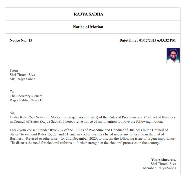 DMK के सांसद तिरुचि शिवा ने राज्यसभा में नियम 267 के तहत कार्य स्थगन का नोटिस दिया है और देश में चुनावी प्रक्रियाओं को और मज़बूत बनाने के लिए चुनावी सुधारों पर तत्काल चर्चा कराने की मांग की है.