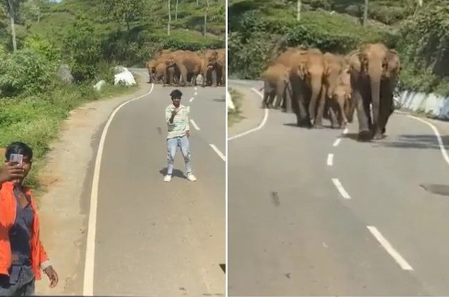 рд╡рд╛рдпрд░рд▓ рд╡реАрдбрд┐рдпреЛ рдореЗрдВ рджрд┐рдЦ рд░рд╣рд╛ рд╣реИ рдХрд┐ рдЬрдВрдЧрд▓реА рд╣рд╛рдерд┐рдпреЛрдВ рдХрд╛ рдЭреБрдВрдб рд╕рдбрд╝рдХ рдкрд╛рд░ рдХрд░ рд░рд╣рд╛ рд╣реЛрддрд╛ рд╣реИред рдЗрд╕реА рджреМрд░рд╛рди рджреВрд╕рд░реА рдУрд░ рд╕реЗ рдХрд╛рд░ рдФрд░ рдмрд╛рдЗрдХ рд╕рд╡рд╛рд░ рд╡рд╣рд╛рдВ рдкрд╣реБрдВрдЪрддреЗ рд╣реИрдВред рд╣рд╛рдерд┐рдпреЛрдВ рдХреЗ рдЭреБрдВрдб рдХреЛ рджреЗрдЦрдиреЗ рдХреЗ рдмрд╛рдж рд╡реЗ рдХрд╛рд░ рдФрд░ рдмрд╛рдЗрдХ рд░реЛрдХрдХрд░ рд╕реЗрд▓реНрдлреА рд▓реЗрдиреЗ рд▓рдЧрддреЗ рд╣реИрдВред рдЗрд╕ рджреМрд░рд╛рди рджреЛ рд▓рдбрд╝рдХреЗ рд╕рдбрд╝рдХ рдкрд░ рдЖрддреЗ рд╣реИрдВ рдФрд░ рд╣рд╛рдерд┐рдпреЛрдВ рдХреЗ рдЖрдЧреЗ рдЦрдбрд╝реЗ рд╣реЛрдХрд░ рд╕реЗрд▓реНрдлреА рдХреНрд▓рд┐рдХ рдХрд░рдиреЗ рд▓рдЧрддреЗ рд╣реИрдВред