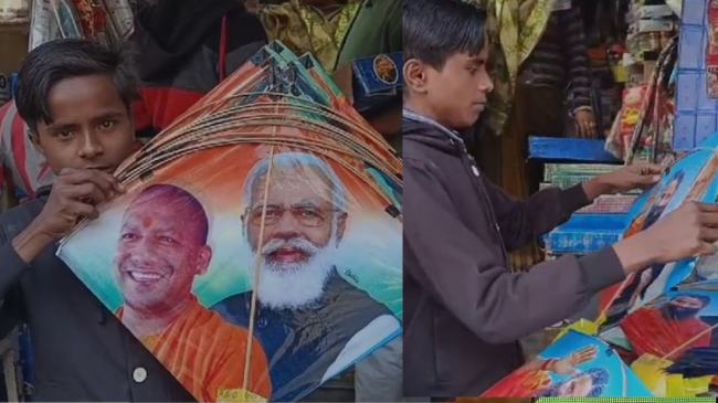 मोदी और योगी की पतंगों से सजा बाजार