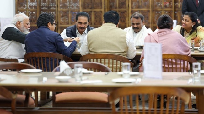 рдкреНрд░рдзрд╛рдирдордВрддреНрд░реА рдирд░реЗрдВрджреНрд░ рдореЛрджреА рдХреЗ рд╕рд╛рде рдПрд▓ рдореБрд░реВрдЧрди (BJP), рд░рд┐рддреЗрд╢ рдкрд╛рдВрдбреЗ (BSP), рд╣рд┐рдирд╛ рдЧрд╛рд╡рд┐рдд (BJP), рдХреЛрдиреНрдпрд╛рдХ (BJP), рдПрди рдкреНрд░реЗрдордЪрдВрджреНрд░рди (рд░рд┐рд╡реЛрд▓реНрдпреВрд╢рдирд░реА рд╕реЛрд╢рд▓рд┐рд╕реНрдЯ рдкрд╛рд░реНрдЯреА), рд╕рд╕реНрдорд┐рдд рдкрд╛рддреНрд░рд╛ (BJD), рд░рд╛рдо рдореЛрд╣рди рдирд╛рдпрдбреВ (TDP), рд▓рджреНрджрд╛рдЦ рдХреЗ рд╕рд╛рдВрд╕рдж рдЬрдордпрд╛рдВрдЧ рд╕реЗрд░рд┐рдВрдЧ рдирд╛рдордЧреНрдпрд╛рд▓ рдиреЗ рд╕рдВрд╕рдж рдХреА рдХреИрдВрдЯреАрди рдореЗрдВ рд▓рдВрдЪ рдХрд┐рдпрд╛, рдЬрд┐рдиреНрд╣реЗрдВ рдкреНрд░рдзрд╛рдирдордВрддреНрд░реА рдиреЗ рдЦреБрдж рдЕрдиреЛрдЦреЗ рдЕрдВрджрд╛рдЬ рдореЗрдВ рд╕рд╛рде рд▓рдВрдЪ рдХрд░рдиреЗ рдХреЗ рд▓рд┐рдП рдЖрдордВрддреНрд░рд┐рдд рдХрд┐рдпрд╛ рдерд╛ред PMO рдХреЗ рдЬрд░рд┐рдП рд╕рд╛рдВрд╕рджреЛрдВ рдХреЛ рдмреБрд▓рд╛рд╡рд╛ рднреЗрдЬрд╛ рдЧрдпрд╛ред рд╕рд╛рдВрд╕рдж рдмреБрд▓рд╛рд╡рд╛ рд╕реБрдирдХрд░ рдПрдХ рдмрд╛рд░ рддреЛ рдШрдмрд░рд╛ рдЧрдП, рдлрд┐рд░ рдЬрдм рд╡реЗ рдкреНрд░рдзрд╛рдирдордВрддреНрд░реА рдХреЗ рдкрд╛рд╕ рдЧрдП рддреЛ рдЙрдиреНрд╣реЛрдВрдиреЗ рднреА рдХрд╣рд╛ рдХрд┐ рдЖрдЬ рддреБрдореНрд╣реЗ рд╕рдЬрд╛ рджреА рдЬрд╛рддреА рд╣реИред рдЪрд▓реЛ рдореЗрд░реЗ рд╕рд╛рде рдЪрд▓реЛред