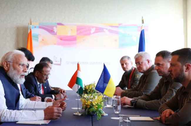 वलोडिमिर ज़ेलेंस्की से मुलाकात की है। रूस के साथ जंग के बीच ये पहली बार है जब दोनों देश के प्रमुख मिले हैं। मुलाकात दौरान राष्ट्रीय सुरक्षा सलाहकार अजीत डोभाल भी मौजूद रहे। भारत, अमेरिका समेत दुनिया के ताकतवर नेता यहां जी7 शिखर सम्मेलन के लिए पहुंचे हुए हैं। इससे पहले पीएम मोदी और जेलेंस्की के बीच कई बार फोन पर बात हुई है।