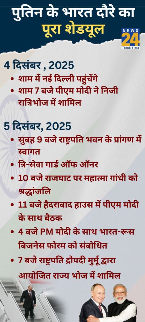 - 4 दिसंबर की शाम राष्ट्रपति पुतिन नई दिल्ली पहुंचेंगे।