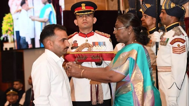 President Droupadi Murmu conferred Shaurya Chakra upon Shri Parshotam Kumar, a farmer and member of Village Defence Committee. He displayed astute patriotism and inspirational acts of gallantry under fire when he tailed the terrorists and maintained contact till security forces… pic.twitter.com/Grq5O5KNDy