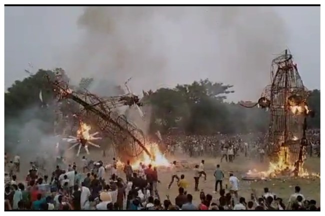 Haryana: यमुना नगर में रावण पुतला दहन के दौरान बड़ा हादसा हुआ है। यहां जलता हुआ पुतला आसपास मेला देखने आए लोगों पर गिर गया। बताया जा रहा है कि पुतला गिरने से कुछ लोग मामूली घायल हुए हैं। स्थानीय प्रशासन व पुलिस बल बचाव कार्य में लगा है।