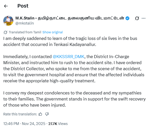 рдЙрдиреНрд╣реЛрдВрдиреЗ X рдкрд░ рдПрдХ рдкреЛрд╕реНрдЯ рдореЗрдВ рд▓рд┐рдЦрд╛, ‘рддреЗрдирдХрд╛рд╕реА рдХрджрдпрд╛рдирд▓реНрд▓реВрд░ рдореЗрдВ рд╣реБрдП рдмрд╕ рдПрдХреНрд╕реАрдбреЗрдВрдЯ рдореЗрдВ рдЫрд╣ рд▓реЛрдЧреЛрдВ рдХреА рджреБрдЦрдж рдореМрдд рдХреА рдЦрдмрд░ рд╕реБрдирдХрд░ рдореБрдЭреЗ рдмрд╣реБрдд рджреБрдЦ рд╣реБрдЖ. рдореИрдВрдиреЗ рдбрд┐рд╕реНрдЯреНрд░рд┐рдХреНрдЯ рдХрд▓реЗрдХреНрдЯрд░ рдХреЛ, рдЬрд┐рдиреНрд╣реЛрдВрдиреЗ рдПрдХреНрд╕реАрдбреЗрдВрдЯ рдХреА рдЬрдЧрд╣ рд╕реЗ рдореБрдЭрд╕реЗ рдмрд╛рдд рдХреА рдереА, рд╕рд░рдХрд╛рд░реА рд╣реЙрд╕реНрдкрд┐рдЯрд▓ рдЬрд╛рдиреЗ рдФрд░ рдпрд╣ рдкрдХреНрдХрд╛ рдХрд░рдиреЗ рдХрд╛ рдЖрджреЗрд╢ рджрд┐рдпрд╛ рд╣реИ рдХрд┐ рдкреНрд░рднрд╛рд╡рд┐рдд рд▓реЛрдЧреЛрдВ рдХреЛ рд╕рд╣реА рдФрд░ рдЕрдЪреНрдЫреА рдХреНрд╡рд╛рд▓рд┐рдЯреА рдХрд╛ рдЗрд▓рд╛рдЬ рдорд┐рд▓реЗ. рдореИрдВ рдореГрддрдХреЛрдВ рдХреЗ рдкреНрд░рддрд┐ рдЕрдкрдиреА рдЧрд╣рд░реА рд╕рдВрд╡реЗрджрдирд╛ рдФрд░ рдЙрдирдХреЗ рдкрд░рд┐рд╡рд╛рд░реЛрдВ рдХреЗ рдкреНрд░рддрд┐ рдЕрдкрдиреА рд╣рдорджрд░реНрджреА рдЬрд╛рд╣рд┐рд░ рдХрд░рддрд╛ рд╣реВрдВ. рд╕рд░рдХрд╛рд░ рдШрд╛рдпрд▓реЛрдВ рдХреЗ рдЬрд▓реНрджреА рдареАрдХ рд╣реЛрдиреЗ рдХреЗ рд▓рд┐рдП рдкреВрд░реА рддрд░рд╣ рддреИрдпрд╛рд░ рд╣реИ.’