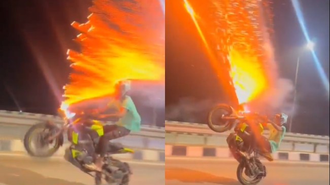 рдПрдХ рдЪреМрдВрдХрд╛рдиреЗ рд╡рд╛рд▓реА рдШрдЯрдирд╛ рдореЗрдВ рдмрд╛рдЗрдХрд░реНрд╕ рдХреЗ рдПрдХ рдЧреНрд░реБрдк рдХреЛ рд╢рдирд┐рд╡рд╛рд░ рд░рд╛рдд рджрд┐рд╡рд╛рд▓реА рдХрд╛ рдЬрд╢реНрди рдордирд╛рддреЗ рд╣реБрдП рддрд┐рд░реБрдЪрд┐рд░рд╛рдкрд▓реНрд▓реА рдореЗрдВ рд╕реНрдЯрдВрдЯ рдХрд░рддреЗ рд╕рдордп рдкрдЯрд╛рдЦреЗ рдлреЛрдбрд╝рддреЗ рджреЗрдЦрд╛ рдЧрдпрд╛ред┬а11 рдирд╡рдВрдмрд░ рдХреЛ рд╣реБрдИ рдЗрд╕ рдШрдЯрдирд╛ рдХрд╛ рд╡реАрдбрд┐рдпреЛ рд╕реЛрдорд╡рд╛рд░ рдХреЛ рд╕реЛрд╢рд▓ рдореАрдбрд┐рдпрд╛ рдкрд░ рд╡рд╛рдпрд░рд▓ рд╣реЛ рдЧрдпрд╛ред рд╡рд╛рдпрд░рд▓ рд╡реАрдбрд┐рдпреЛ рдореЗрдВ рдпреБрд╡рдХ рдХреЛ рдмрд╛рдЗрдХ рдХреЗ рдЕрдЧрд▓реЗ рдкрд╣рд┐рдпреЗ рдХреЛ рд╕рдбрд╝рдХ рд╕реЗ рдКрдкрд░ рдЙрдард╛рдХрд░ рдФрд░ рдкрдЯрд╛рдЦреЗ рдлреЛрдбрд╝рддреЗ рд╣реБрдП рджреЗрдЦрд╛ рдЬрд╛ рд╕рдХрддрд╛ рд╣реИред