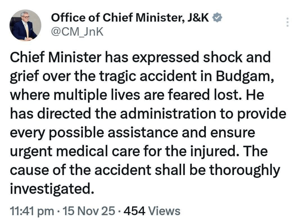 प्रत्यक्षदर्शियों ने बताया कि स्थानीय लोग और राहगीर घटनास्थल पर पहुंचे और इमरजेंसी सेवाओं के पहुंचने से पहले ही क्षतिग्रस्त वाहन से घायलों को निकालना शुरू कर दिया. क्षतिग्रस्त वाहनों और बचाव कार्यों के कारण सड़क कुछ देर तक अवरुद्ध रही. इस बीच, नेशनल कॉन्फ्रेंस के प्रवक्ता ने एक बयान में कहा कि पार्टी अध्यक्ष डॉ. फारूक अब्दुल्ला और उपराष्ट्रपति एवं मुख्यमंत्री उमर अब्दुल्ला ने बडगाम में हुए इस दुखद सड़क हादसे पर गहरा सदमा और दुख व्यक्त किया है, जिसमें कई लोगों के मारे जाने की आशंका है. पुलिस ने मामले का संज्ञान लिया है और दुर्घटना के कारणों का पता लगाने के लिए जांच शुरू कर दी है.