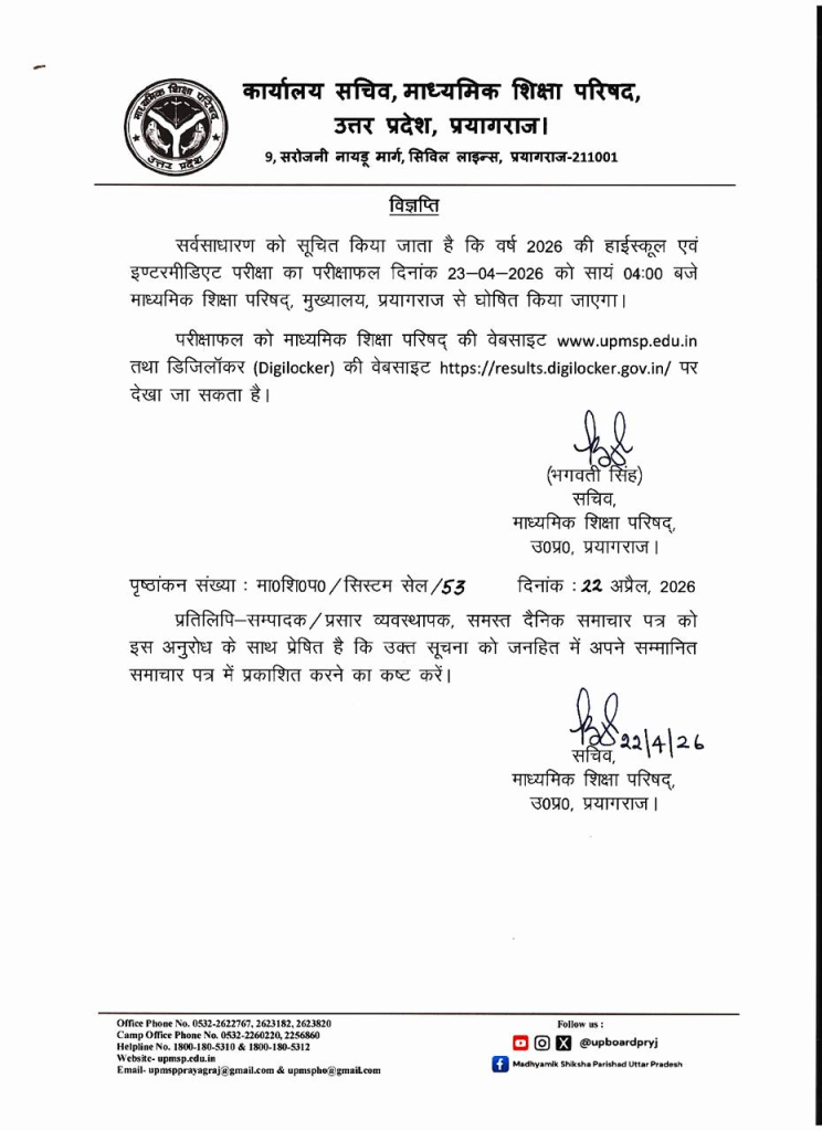 जारी किए गए नोटिस में कहा गया है, ‘सूचित किया जाता है कि वर्ष 2026 की हाईस्कूल एवं इण्टरमीडिएट परीक्षा का परीक्षाफल दिनांक 23 अप्रैल को शाम 4 बजे माध्यमिक शिक्षा परिषद्, मुख्यालय, प्रयागराज से घोषित किया जाएगा. परीक्षाफल को माध्यमिक शिक्षा परिषद् की वेबसाइट www.upmsp.edu.in या डिजिलॉकर की वेबसाइट https://results.digilocker.gov.in/ पर देखा जा सकता है.’