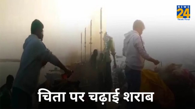वीडियो सामने आया है जिसे देखकर हर कोई हैरान है। यहां एक शख्स ने अपने पिता की चिता पर न सिर्फ शराब चढ़ाई बल्कि पान और बीड़ी भी रख दी। उसके पिता के अंतिम संस्कार का यह वीडियो