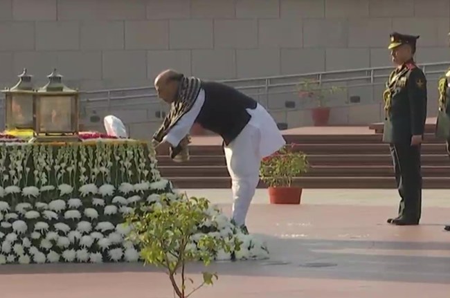 Delhi | CDS General Anil Chauhan, Army chief General Manoj Pande, Air Force chief Air Chief Marshal VR Chaudhari and Vice Chief of Indian Navy Vice Admiral SN Ghormade lay wreaths at the National War Memorial on the occasion of #VijayDiwas2022 pic.twitter.com/m54C8QElhx