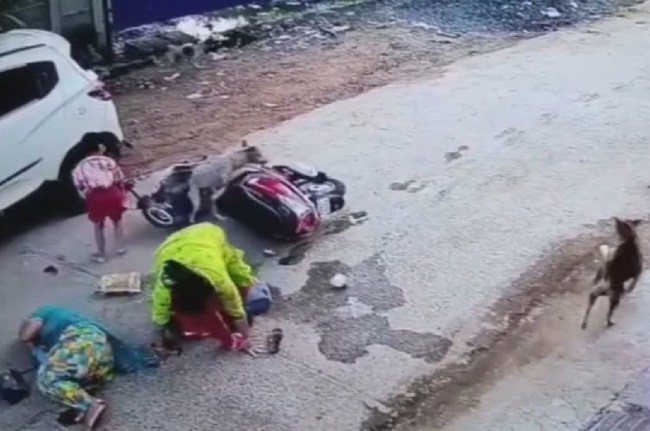 рд╡реАрдбрд┐рдпреЛ рдореЗрдВ, рдорд╣рд┐рд▓рд╛рдУрдВ рдФрд░ рдмрдЪреНрдЪреЗ рдХреЛ рдЙрдарддреЗ рд╣реБрдП рджреЗрдЦрд╛ рдЬрд╛ рд╕рдХрддрд╛ рд╣реИ рдФрд░ рдПрдХ рдЖрд╡рд╛рд░рд╛ рдХреБрддреНрддрд╛ рдЬреЛ рд╕реНрдХреВрдЯрд░ рдХреЗ рдЧрд┐рд░рдиреЗ рдХреЗ рдмрд╛рдж рдЙрд╕рдХреЗ рдиреАрдЪреЗ рдЖ рдЧрдпрд╛, рд╡рд╣ рднреА рднрд╛рдЧ рдЧрдпрд╛ред рдмрд╛рдХреА рдХреБрддреНрддреЛрдВ рдХреЛ рднреА рдШрдЯрдирд╛ рдХреЗ рдмрд╛рдж рднрд╛рдЧрддреЗ рджреЗрдЦрд╛ рдЬрд╛ рд╕рдХрддрд╛ рд╣реИред