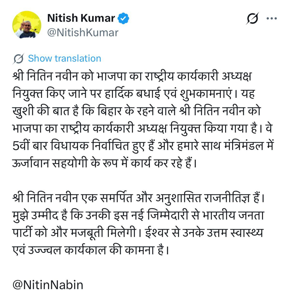 नितिन नबीन को नियुक्ति पर बधाई देते हुए प्रधानमंत्री नरेंद्र मोदी ने लिखा कि नितिन नबीन जी युवा और कर्मठ नेता हैं, जिनका बिहार में मंत्री के रूप में कार्यकाल प्रभावशाली रहा है. विनम्र स्वभाव और व्यावहारिक कार्यशैली के लिए जाने जाते हैं. मुझे विश्वास है कि उनकी ऊर्जा और समर्पण आने वाले समय में पार्टी को मजबूत करेंगे. भाजपा के राष्ट्रीय कार्यकारी अध्यक्ष बनने पर उन्हें हार्दिक बधाई.”