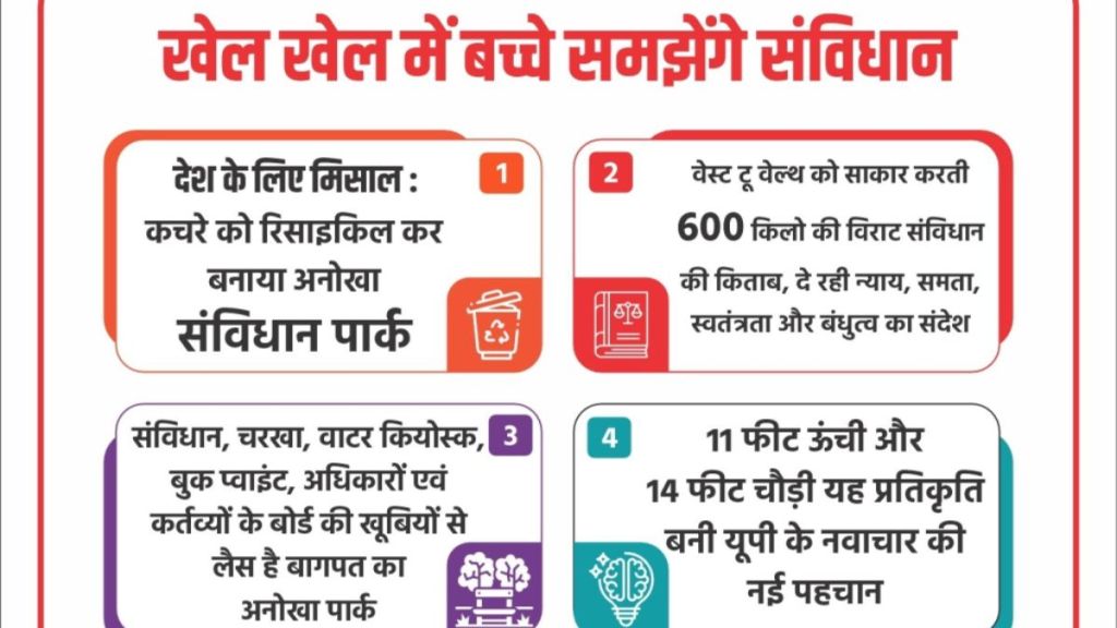 बागपत के बड़ौत में विकसित अनोखा संविधान पार्क बच्चों, युवाओं और आमजन को खेल-खेल में संविधान के मूल्यों से जोड़ रहा है. कचरे से बने इस पार्क ने “वेस्ट टू वेल्थ” की अवधारणा को साकार करते हुए देश के लिए एक प्रेरक मॉडल प्रस्तुत किया है.
