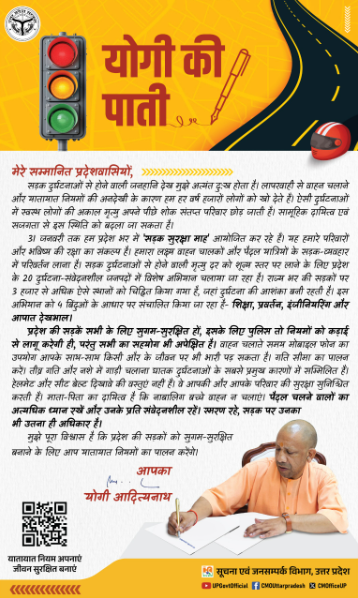 उत्तर प्रदेश के मुख्यमंत्री योगी आदित्यनाथ ने प्रदेश के लोगों को ‘योगी की पाती’ नाम की चिट्ठी लिखकर सड़क हादसे रोकने के लिए सबको मिलकर जागरूक होने की अपील की है. उन्होंने कहा कि सड़क हादसों में हर साल हजारों लोग अपनी जान गंवा देते हैं, जिससे परिवारों की खुशियां हमेशा के लिए उजड़ जाती हैं.