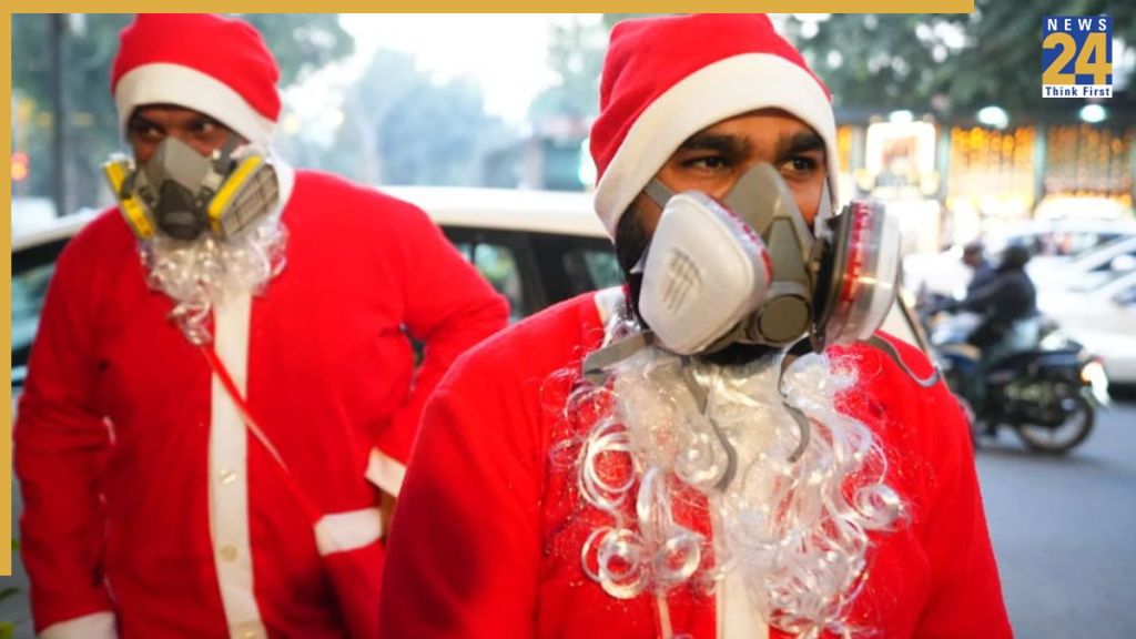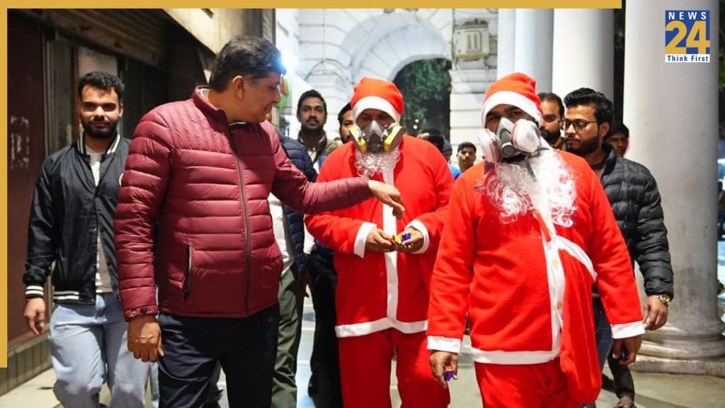 दिल्ली के कनॉट प्लेस में लोगों में टॉफी और चाकलेट बांटने आए सेंटा क्लॉज खतरनाक प्रदूषण से बीमार पड़ गए. जब वह थोड़ा स्वास्थ्य हुए तो उन्होंने आम आदमी पार्टी के दिल्ली प्रदेश संयोजक सौरभ भारद्वाज, विधायक संजीव झा समेत अन्य नेताओं के साथ लोगों में टॉफी बांटी. सौरभ भारद्वाज ने भाजपा सरकार पर कटाक्ष करते हुए कहा कि जब सेंटा को दिल्ली का एक्यूआई दिखाया गया तो वह बेहोश हो गए. इसके बाद मजबूरी में उन्हें गैस मास्क लगाने पड़े और दिल्ली की जहरीली हवा से बच पाए. सौरभ भारद्वाज ने कहा कि सेंटा क्लॉज ने भाजपा सरकार को संदेश दिया कि कुछ काम करें. दिल्लीवालों ने उन्हें एक ही मौका दिया है. दिल्ली की हवा की तरह भाजपा सरकार का प्रशासन भी वेरी पुअर है. इन्हें माफी मांगने के बजाय इस्तीफा देना चाहिए.