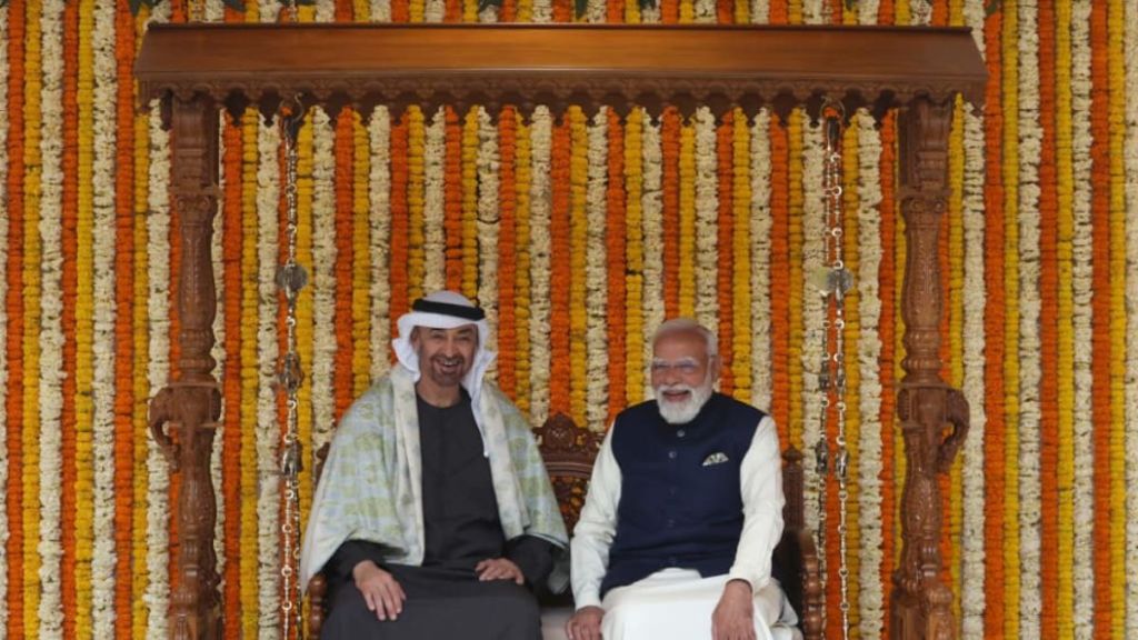 рднрд╛рд░рдд рдФрд░ рд╕рдВрдпреБрдХреНрдд рдЕрд░рдм рдЕрдореАрд░рд╛рдд (рдпреВрдПрдИ) рдХреЗ рдмреАрдЪ рдордЬрдмреВрдд рд╣реЛрддреЗ рд░рд┐рд╢реНрддреЛрдВ рдХреА рдПрдХ рдФрд░ рдЭрд▓рдХ рдЙрд╕ рд╕рдордп рджреЗрдЦрдиреЗ рдХреЛ рдорд┐рд▓реА, рдЬрдм рдпреВрдПрдИ рдХреЗ рд░рд╛рд╖реНрдЯреНрд░рдкрддрд┐ рд╢реЗрдЦ рдореЛрд╣рдореНрдордж рдмрд┐рди рдЬрд╝рд╛рдИрдж рдЕрд▓ рдирд╛рд╣рдпрд╛рди рднрд╛рд░рдд рдХреЗ рд╕рдВрдХреНрд╖рд┐рдкреНрдд рджреМрд░реЗ рдкрд░ рдкрд╣реБрдВрдЪреЗ. рдЗрд╕ рджреМрд░рд╛рди рдкреНрд░рдзрд╛рдирдордВрддреНрд░реА рдирд░реЗрдВрджреНрд░ рдореЛрджреА рдиреЗ рдЙрдирдХрд╛ рд╕реНрд╡рд╛рдЧрдд рдХрд░ рднрд╛рд░рдд рдХреА рд╕рдореГрджреНрдз рд╕рдВрд╕реНрдХреГрддрд┐ рдФрд░ рдкрд░рдВрдкрд░рд╛ рд╕реЗ рдЬреБрдбрд╝реЗ рдЦрд╛рд╕ рдЙрдкрд╣рд╛рд░ рднреЗрдВрдЯ рдХрд┐рдП.