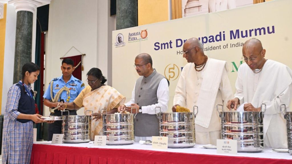 राष्ट्रपति भवन सांस्कृतिक केंद्र में अक्षय पात्र फाउंडेशन ने 5 अरबवीं थाली परोसने का उत्सव मनाया. 25 वर्ष की इस साधना-यात्रा के उत्सव में भारत की माननीय राष्ट्रपति श्रीमती द्रौपदी मुर्मू मुख्य अतिथि, शिक्षा मंत्री श्री धर्मेंद्र प्रधान विशिष्ट अतिथि के रुप में शामिल हुए. कार्यक्रम में अक्षय पात्र के संस्थापक-चेयरमैन और इस्कॉन बेंगलोर के प्रेसिडेंट श्री मधु पंडित दास तथा वाइस चेयरमैन श्री चंचलापति दास उपस्थित रहे.