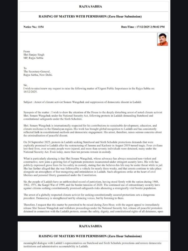 рд╕рдВрдЬрдп рд╕рд┐рдВрд╣ рдиреЗ рд╕рджрди рдореЗрдВ рдХрд╣рд╛ рдХрд┐ рд╕реЛрдирдо рд╡рд╛рдВрдЧрдЪреБрдХ рдЬрд┐рдиреНрд╣реЛрдВрдиреЗ рд╢рд┐рдХреНрд╖рд╛, рд╕рддрдд рд╡рд┐рдХрд╛рд╕ рдФрд░ рд╣рд┐рдорд╛рд▓рдпреА рдХреНрд╖реЗрддреНрд░ рдореЗрдВ рдЬрд▓рд╡рд╛рдпреБ рд╕рдВрд░рдХреНрд╖рдг рдХреЗ рд▓рд┐рдП рдРрддрд┐рд╣рд╛рд╕рд┐рдХ рдХрд╛рд░реНрдп рдХрд┐рдП рд╣реИрдВ, рдХреЛрдИ рдЕрдкрд░рд╛рдзреА рдирд╣реАрдВ, рдмрд▓реНрдХрд┐ рдЕрдВрддрд░рд░рд╛рд╖реНрдЯреНрд░реАрдп рд╕реНрддрд░ рдкрд░ рд╕рдореНрдорд╛рдирд┐рдд рдЬрд▓рд╡рд╛рдпреБ рдХрд╛рд░реНрдпрдХрд░реНрддрд╛, рд╢рд┐рдХреНрд╖рд╛рд╡рд┐рдж рдФрд░ рд░рд╛рд╖реНрдЯреНрд░ рдХреЗ рд▓рд┐рдП рд╕реЛрдЪрдиреЗ рд╡рд╛рд▓реЗ рдирд╛рдЧрд░рд┐рдХ рд╣реИрдВ. рдЬрд┐рдиреНрд╣реЛрдВрдиреЗ рд▓рджреНрджрд╛рдЦ рдХреЛ рд╡реИрд╢реНрд╡рд┐рдХ рдкрд╣рдЪрд╛рди рджрд┐рд▓рд╛рдИ. рдЙрдиреНрд╣реЛрдВрдиреЗ рд╣рдореЗрд╢рд╛ рдЕрд╣рд┐рдВрд╕рдХ, рд▓реЛрдХрддрд╛рдВрддреНрд░рд┐рдХ рдФрд░ рд╕рдВрд╡реИрдзрд╛рдирд┐рдХ рддрд░реАрдХреЛрдВ рд╕реЗ рдЕрдкрдиреА рдмрд╛рдд рд░рдЦреА, рд▓реЗрдХрд┐рди рднрд╛рдЬрдкрд╛ рд╕рд░рдХрд╛рд░ рдиреЗ рдЙрдирдХреА рдЖрд╡рд╛рдЬрд╝ рдХреЛ рдХреБрдЪрд▓рдиреЗ рдХреЗ рд▓рд┐рдП рд░рд╛рд╖реНрдЯреНрд░реАрдп рд╕реБрд░рдХреНрд╖рд╛ рдХрд╛рдиреВрди рдХрд╛ рджреБрд░реБрдкрдпреЛрдЧ рдХрд┐рдпрд╛. рдЙрдиреНрд╣реЛрдВрдиреЗ рдХрд╣рд╛ рдХрд┐ рд╕рд░рдХрд╛рд░ рдЕрдм рд╕рд╡рд╛рд▓ рдкреВрдЫрдиреЗ рд╡рд╛рд▓реЛрдВ рд╕реЗ рдбрд░рдиреЗ рд▓рдЧреА рд╣реИ, рдЗрд╕рд▓рд┐рдП рдЙрдиреНрд╣реЗрдВ рдЬреЗрд▓ рдореЗрдВ рдбрд╛рд▓ рд░рд╣реА рд╣реИ.