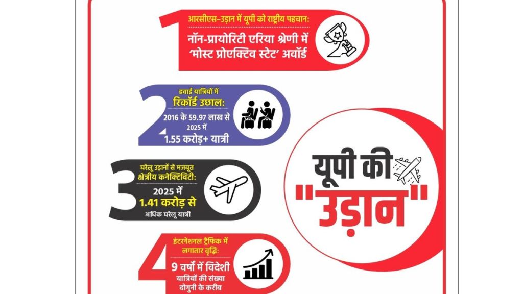 उत्तर प्रदेश सिविल एविएशन के डायरेक्टर ईशान प्रताप सिंह ने बताया कि योगी सरकार की नीतियों का असर यात्री आंकड़ों में भी साफ दिखाई देता है. वर्ष 2016 में प्रदेश में कुल 59.97 लाख हवाई यात्री थे. 2024 में यह संख्या 1.28 करोड़ से अधिक और 2025 तक यह संख्या बढ़कर 1.55 करोड़ से अधिक हो गई. बीते नौ वर्षों में प्रदेश में 9.98 प्रतिशत कंपाउंड एनुअल ग्रोथ रेट (सीएजीआर) से यात्री यातायात बढ़ा है, जो यह दर्शाता है कि हवाई यात्रा अब आम नागरिकों के लिए भी सुलभ होती जा रही है. यह ‘उड़ान-उड़े देश का आम नागरिक’ के मूल उद्देश्य को जमीन पर उतारने का प्रमाण है.