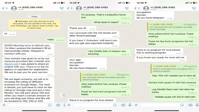 16 рдЕрдХреНрдЯреВрдмрд░ рдХреЛ рдЕрдкрдиреЗ рд╕реЛрд╢рд▓ рдореАрдбрд┐рдпрд╛ рд╣реИрдВрдбрд▓рд░ рдкрд░ рдпрд╣ рдкреЛрд╕реНрдЯ рд╢реЗрдпрд░ рдХрд░рддреЗ рд╣реБрдП рдЪреЗрдЯреНрдЯреА рдЕрд░реБрдг рдирд╛рдордХ рдЗрд╕ рд╢рдЦреНрд╕ рдиреЗ рдмрддрд╛рдпрд╛ рд╣реИ рдХрд┐ рдЙрд╕ рдПрдХ рджрд┐рди рд▓рд╛рд╡рдгреНрдпрд╛ рдирд╛рдордХ рдПрдХ рд╡реНрд╣рд╛рдЯреНрд╕рдРрдк рдпреВрдЬрд░ рдХреА рддрд░рдл рд╕реЗ рдореИрд╕реЗрдЬ рдЖрдпрд╛ред рдЪреИрдЯ рдореЗрдВ рдШреЛрдЯрд╛рд▓реЗрдмрд╛рдЬ рдиреЗ рдХрд╣рд╛ рдХрд┐ рдЙрд╕реЗ рд▓рд┐рдВрдХреНрдбрдЗрди рдФрд░ Naukri.com рдЬреИрд╕реЗ рдкреЗрд╢реЗрд╡рд░ рдиреЗрдЯрд╡рд░реНрдХ рд╕реЗ рдЪреЗрдЯреНрдЯреА рдХреЗ рд╕рдВрдкрд░реНрдХ рд╡рд┐рд╡рд░рдг рдкреНрд░рд╛рдкреНрдд рд╣реБрдПред рдЙрдиреНрд╣реЛрдВрдиреЗ рдХрд╣рд╛ рдХрд┐ рдЪреЗрдЯреНрдЯреА рдЧреВрдЧрд▓ рдкрд░ рд░рд┐рд╡реНрдпреВ рджреЗрдХрд░ рдкреИрд╕реЗ рдХрдорд╛рдПрдВрдЧреЗред рд╣рд╛рд▓рд╛рдВрдХрд┐ рдЗрд╕ рд╕рд╡рд╛рд▓ рдХрд╛ рдЬрд╡рд╛рдм рджреЗрдиреЗ рдХреА рдмрдЬрд╛рдп рдЪреЗрдЯреНрдЯреА рдиреЗ рд▓рд╛рд╡рдгреНрдпрд╛ рдирд╛рдо рдХреА рдкреНрд░рд╢рдВрд╕рд╛ рдХрд░рддреЗ рд╣реБрдП рдЙрд╕рдХрд╛ рдорддрд▓рдм рдкреВрдЫ рд▓рд┐рдпрд╛ред┬ардШреЛрдЯрд╛рд▓реЗрдмрд╛рдЬ рдиреЗ рдзрдиреНрдпрд╡рд╛рдж рдХрд╣рддреЗ рд╣реБрдП рд╡рд╛рдкрд╕ рдкрд╣рд▓реЗ рд╡рд╛рд▓реЗ рдСрдлрд░ рдкрд░ рдЖрдиреЗ рдХреЛ рдХрд╣рд╛,┬атАЬрдХреНрдпрд╛ рдореИрдВ рдкреВрд░реНрдг рд╡рд┐рд╡рд░рдг рдФрд░ рджреИрдирд┐рдХ рдЗрдирд╛рдо рдкреИрдХреЗрдЬ рдХреЗ рд╕рд╛рде рдЖрдЧреЗ рдмрдврд╝ рд╕рдХрддреА рд╣реВрдВ? рдпрджрд┐ рдЖрдкрдХреЗ рдкрд╛рд╕ 1-2 рдорд┐рдирдЯ рд╣реИрдВ рддреЛ рдореИрдВ рдЖрдкрдХреЛ рд╕рд┐рдЦрд╛рдКрдВрдЧреА рдФрд░ рдЖрдкрдХреЛ рддреБрд░рдВрдд рдЕрдкрдирд╛ рднреБрдЧрддрд╛рди рдорд┐рд▓ рдЬрд╛рдПрдЧрд╛’ред