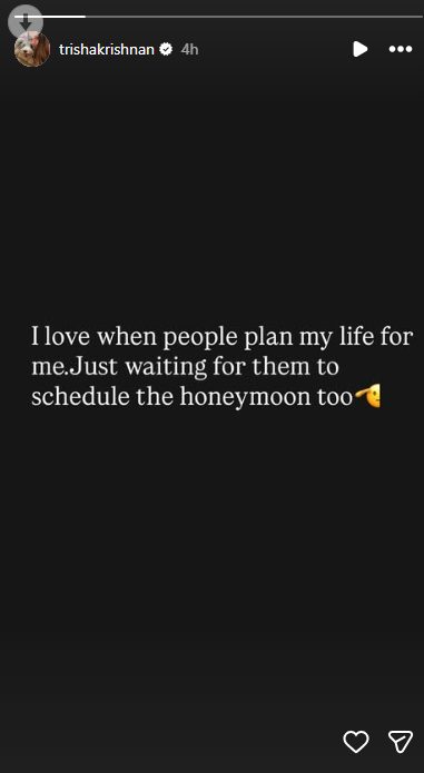 तृषा कृष्णन ने अपने इंस्टाग्राम पर एक स्टोरी शेयर की है. इस पोस्ट में इन रूमर्स को खारिज करते हुए एक्ट्रेस ने लिखा कि मुझे खुशी होती है, जब लोग मेरी लाइफ की योजना बनाते हैं. बस इंतजार है कि वे हनीमून भी तय करें.