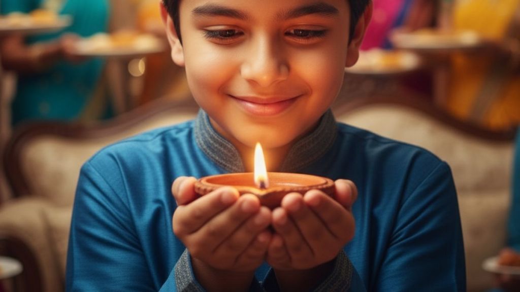 तीसरा प्रॉम्प्ट – turn this image in diwali photo, Close-up shot of man, gently holding a lit traditional diya. The focus is on the warm glow of the lamp and his careful, happy expression. Subtle festive background blur.