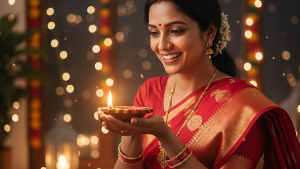 दूसरा प्रॉम्प्ट – Transform the woman’s image into a Diwali-themed photo. Add her holding a lit decorative diya in her hands, or a small sparkler (phuljhadi). Enhance the background with soft, blurred Diwali lights and a hint of festive decor. Give her a joyful, celebratory expression and ensure her attire looks festive.