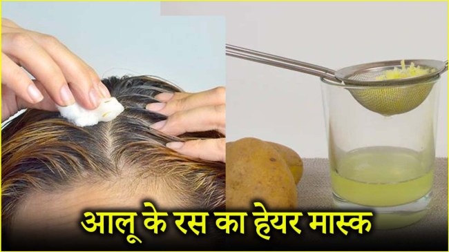 - 2 बड़े चम्मच आलू का रस,1 बड़ा चम्मच शहद,1 अंडा को मिलाकर बालों की जड़ों और स्कैल्प में लगाएं।