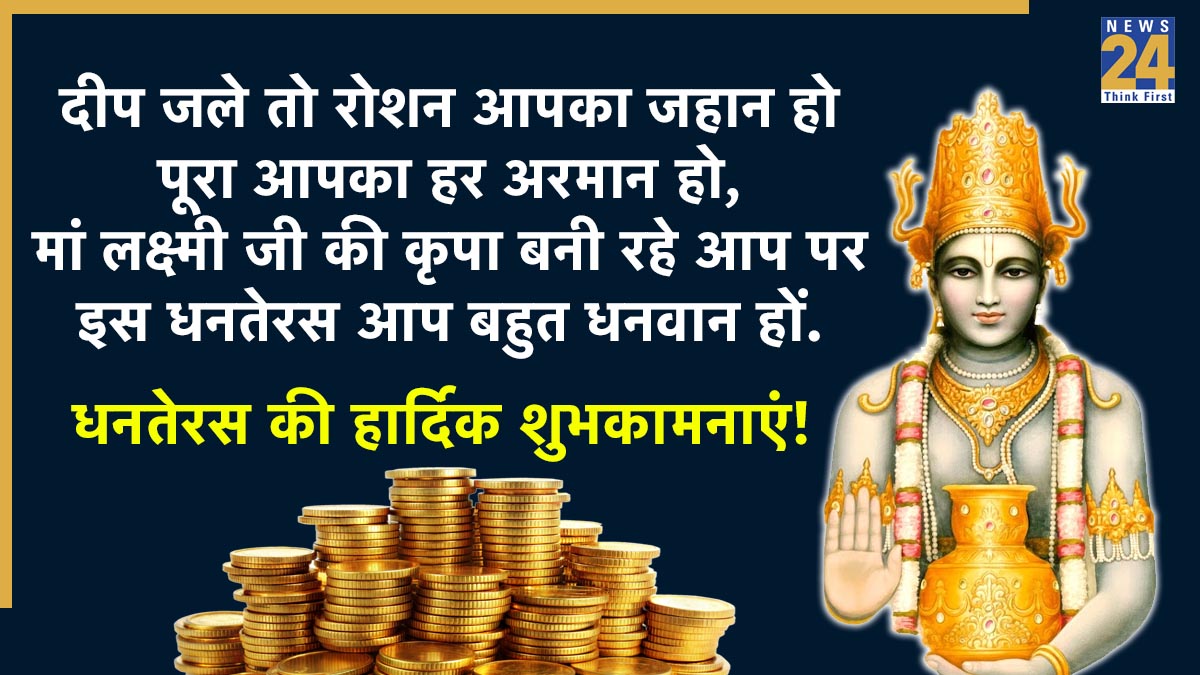 Dhanteras Wishes, Dhanteras Ki Shubhkamnaye Updates in Hindi: हिंदू धर्म में धनतेरस को अत्यधिक शुभ दिन माना जाता है. मान्यतानुसार इस त्योहार पर पूजा करने से मां लक्ष्मी और भगवान धन्वंतरि प्रसन्न होते हैं और घर-परिवार पर धन की वर्षा करते हैं. इस दिन खरीदारी करने का भी विशेष महत्व है, सोने-चांदी से लेकर स्टील और तांबे के बर्तन, इलेक्ट्रॉनिक्स का सामान और जमीन तक खरीदे जाते हैं. ऐसे में इस शुभ दिन पर सभी को आप भी शुभकामना संदेश भेजिए. यहां आपके लिए धनतेरस के खास विशेज और मैसेजेस (Happy Dhanteras Messages) दिए गए हैं जिन्हें भेजकर आप भी सभी को धनतेरस की हार्दिक शुभकामनाएं दे सकते हैं.