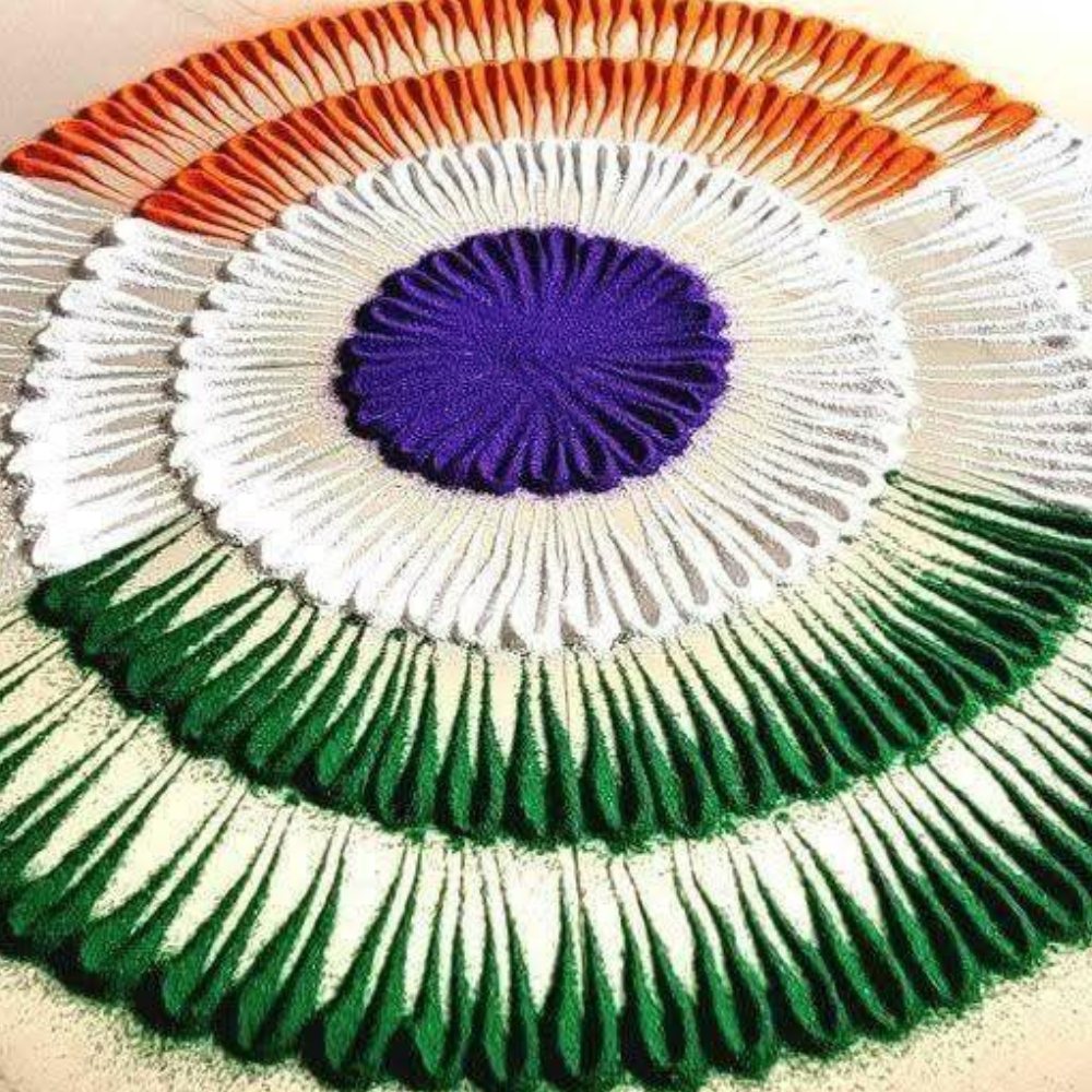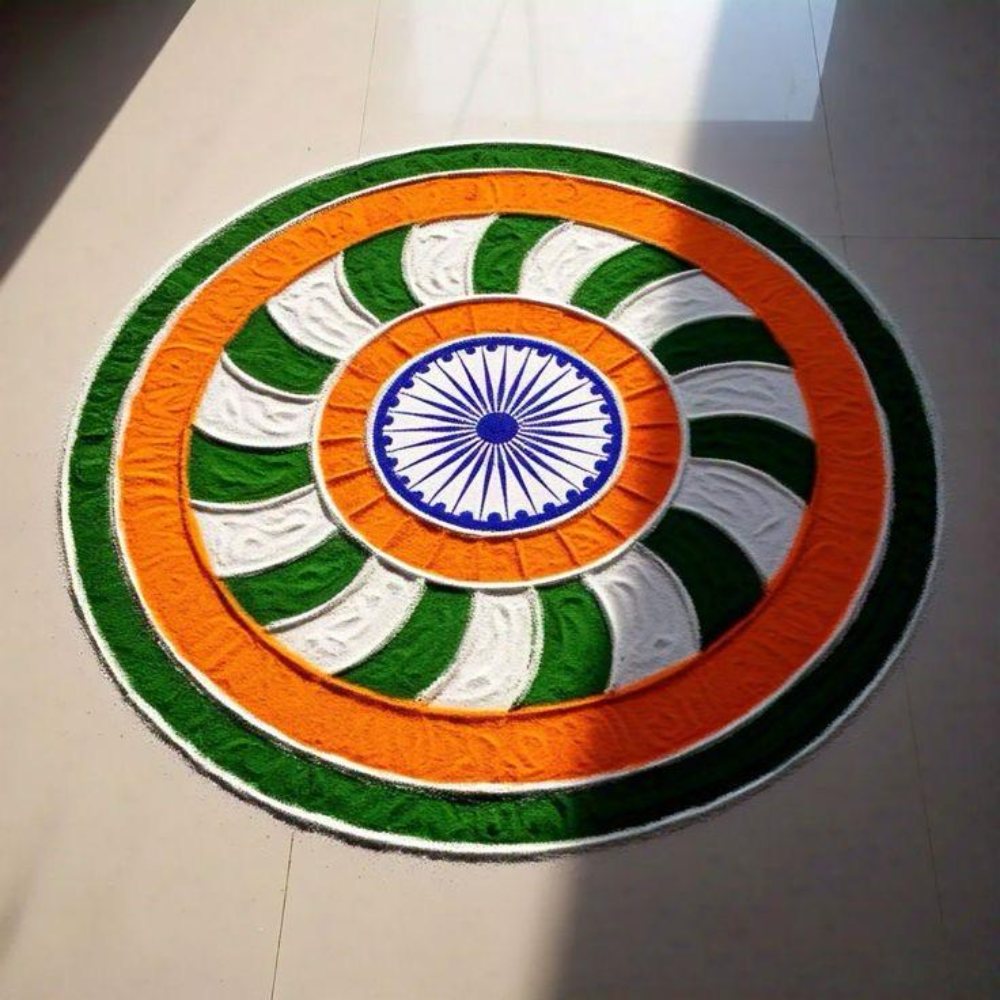 गोलाकार रंगोली बनाना बेहद आसान होता है। इसमें आप बीच में नीले रंग से अशोक चक्र बनाएं और चारों ओर तिरंगे रंग भरें। यह रंगोली कम मेहनत में ज्यादा प्रभाव देती है।