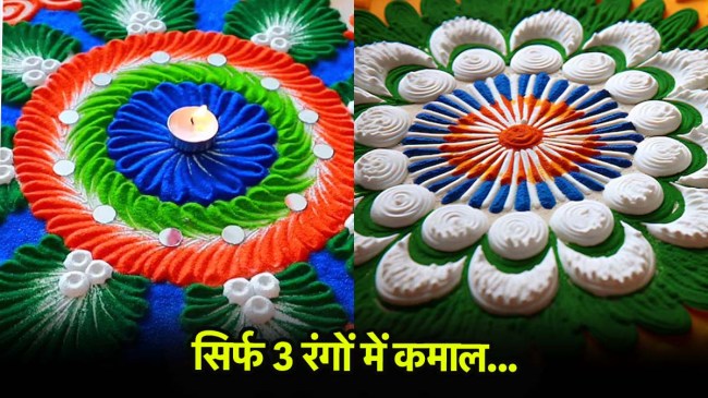 अगर आप कुछ अलग और आसान बनाना चाहते हैं, तो इस रंगोली को जरूर ट्राय करें। इसमें आप किनारों पर फूलों के बजाय राष्ट्रीय ध्वज बना सकते हैं। इसे बनाने में सिर्फ 15 मिनट लगेंगे।