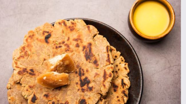 Jaggery Roti Benefit: सर्दियों का मौसम शुरू होते ही शरीर को गर्माहट की जरूरत होती है। इसके लिए आप अपनी डाइट में कई तरह के चीजों को शामिल करते हैं। ऐसे में आप गुड़ की रोटी को भी अपनी डाइट में शामिल कर सकते हैं। ये रोटी खाने में ही टेस्टी नहीं होती, बल्कि शरीर के लिए भी फायदेमंद होती है। गुड़ शरीर को गर्म रखने में मदद करता है और इसमें कई तरह के पोषक तत्व भी पाए जाते हैं। एक्सपर्ट की मानें तो गुड़ की रोटी कार्बोहाइड्रेट और एनर्जी का एक बेहतरीन सोर्स हैं, साथ ही इनमें फाइबर के साथ कई विटामिन और मिनरल भरपूर मात्रा में पाए जाते हैं। आइए जानते हैं इसके फायदे और बनाने का तरीका..