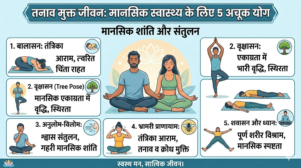 ताड़ासन, वृक्षासन, बालासन और शवासन जैसे आसन मानसिक शांति देने में मदद करते हैं. ये शरीर को रिलैक्स करते हैं और नर्वस सिस्टम को संतुलित रखते हैं.