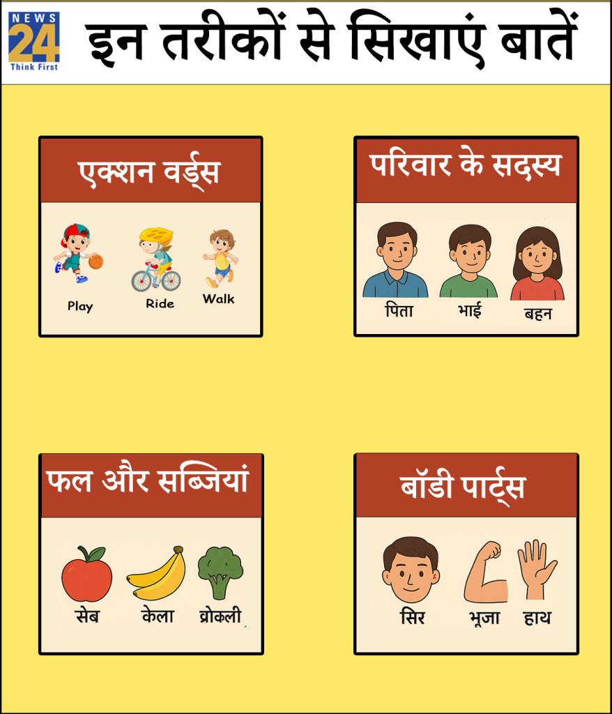 आप इस उम्र में अपने बच्चे को एक्शन वर्ड सिखा सकते हैं। जैसे की बच्चे क्या कर रहे हैं, ये शब्द सिखाएं। चलो, बैठो, खाओ, सो जाओ आप बच्चे को सिखाने के लिए खुद करके दिखाएं, और बच्चे से भी करवाएं। इसके साथ ही हर बार शब्द को दोहराएं।